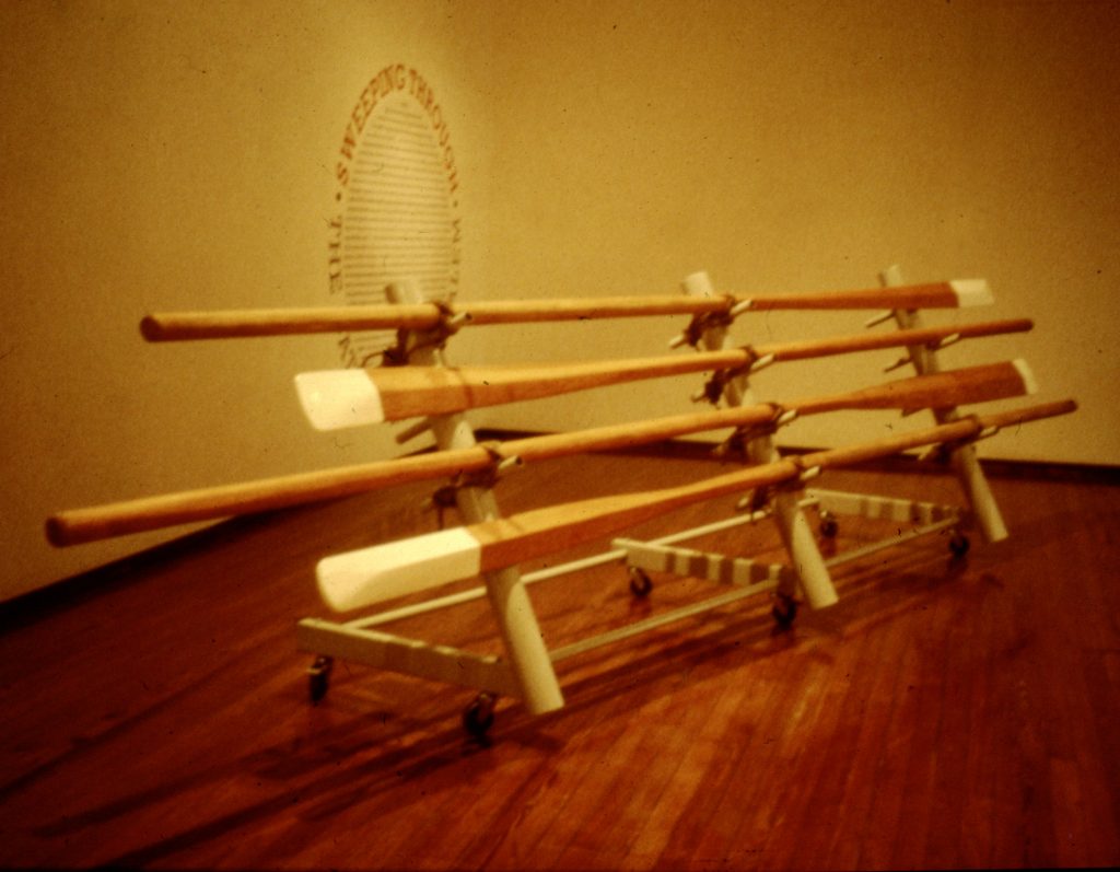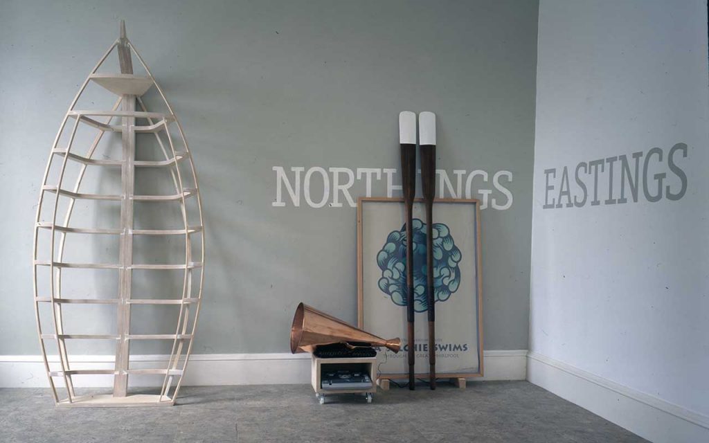 Assembled for an exhibition of work by artists from the North Sea rim. Centred on a constructed small boat frame it was an early essay in multi-part installation: a pair of found oars, a woodcut with screen printed text and a copper speaking trumpet with recorded soundtrack.