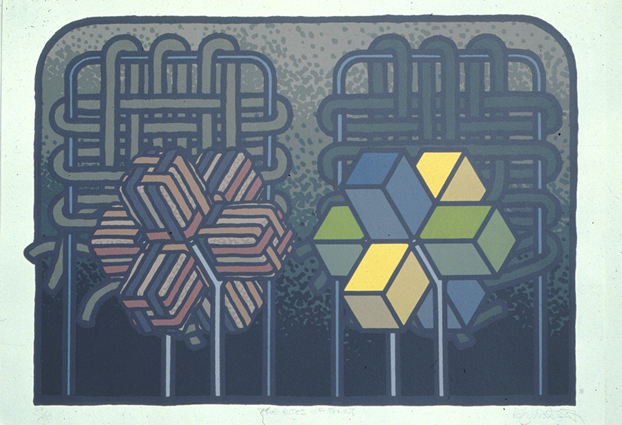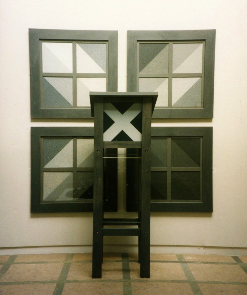 Tonal Cross, shown here was one of five related screen prints, developed from a sequence of six small prints exhibited in 3 Print Workshops at the Scottish Arts Council Fruitmarket Gallery. These works imagined sculptures before sculpture became my main focus. More recently large wood blocks have been exhibited as sculptural objects whilst different iterations of an installation have like prints, been categorised as ‘states’.