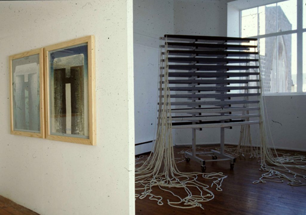 Curated by artist Sonia Rolak, the exhibition explored intersections between fine art, design and craft. My installation centred on a contemporary re-imagining of a wrap-weighted weaving loom. This was shown along with a series of screenprinted book pages which suggested links between singing and weaving, and between North East Italy and North East Scotland.