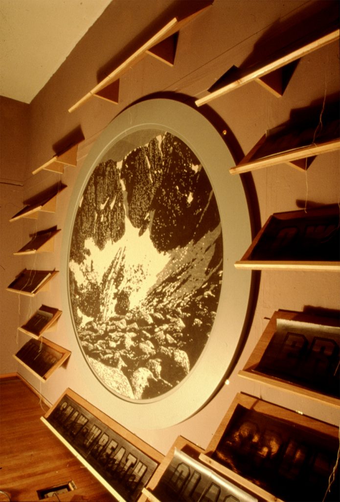 Elements from the Hermitage, a managed landscape on the banks of the Braan outside Dunkeld, are paraphrased here. The original building (1758) was glazed in red and green, overlooking the Black Linn Falls and transforming them into a ‘Cataract of Fire, a Cascade of Liquid Verdigrease’. The folly was refigured in the late 18th century and dedicated to the blind bard Ossian, celebrated by James Macpherson in his Fragments of Ancient Poetry, collected in the Highlands of Scotland and translated from the Gaelic or Erse Language. The sound of the falls was magnified by the structure of the building and their image extended by distorting mirrors. These features were present in the planned installation – mirrors with speakers, red and green filters and a screen- printed image of the falls.