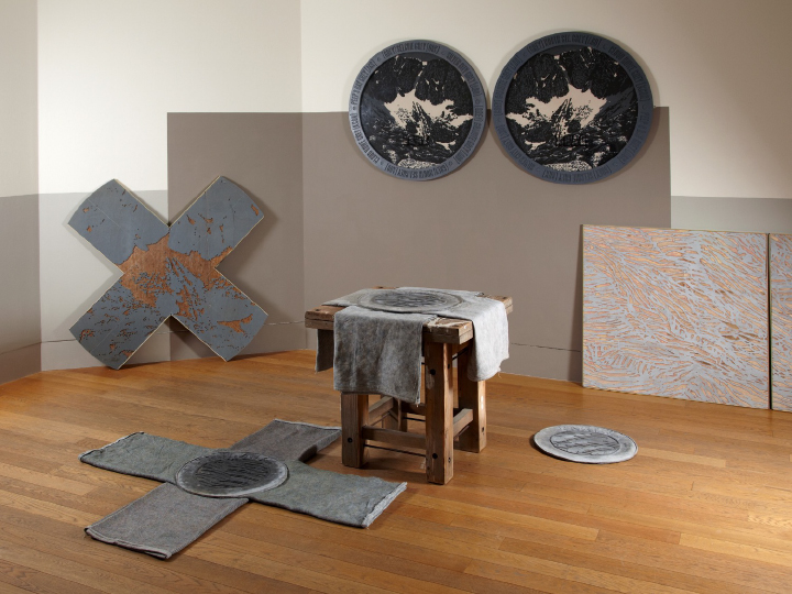 The oak table and lead casts from 6 Skies, Some Family Stereotypes and the cancelled woodblock from Memoria with new elements: two mirror-image woodcuts in circular frames and two woodblocks made from my grandfather’s drawing Near Loch Ness, (further elements – a circular floor, and table, drawing, with prints are out of shot). A further version of this work was invited by the Royal Glasgow Institute.