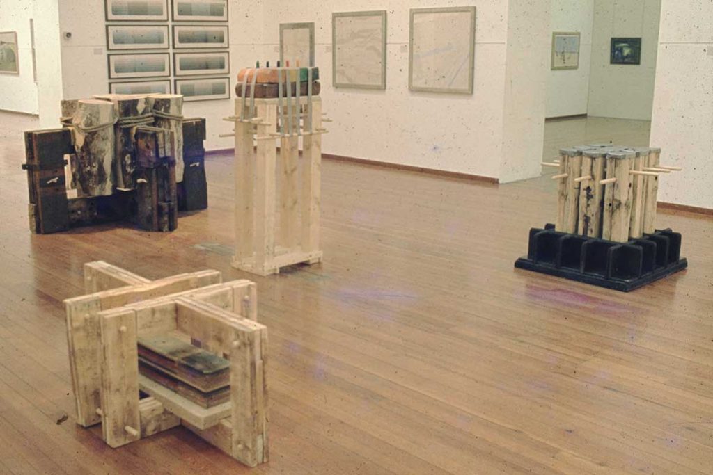 Shown here with three chainsawed woodcuts, nine sleeker pods were made in the gallery and tarred on a Sarajevo building site on the opening day of Richard Demarco’s exhibition, New Tendencies in Scottish Art. Other ‘Scottish’ artists included the Romanian sculptor Paul Neagu with Merlyn Smith, George Wyllie, Ainslie Yule, Glen Onwin, David Mach, Moria Innes and Doug Cocker.