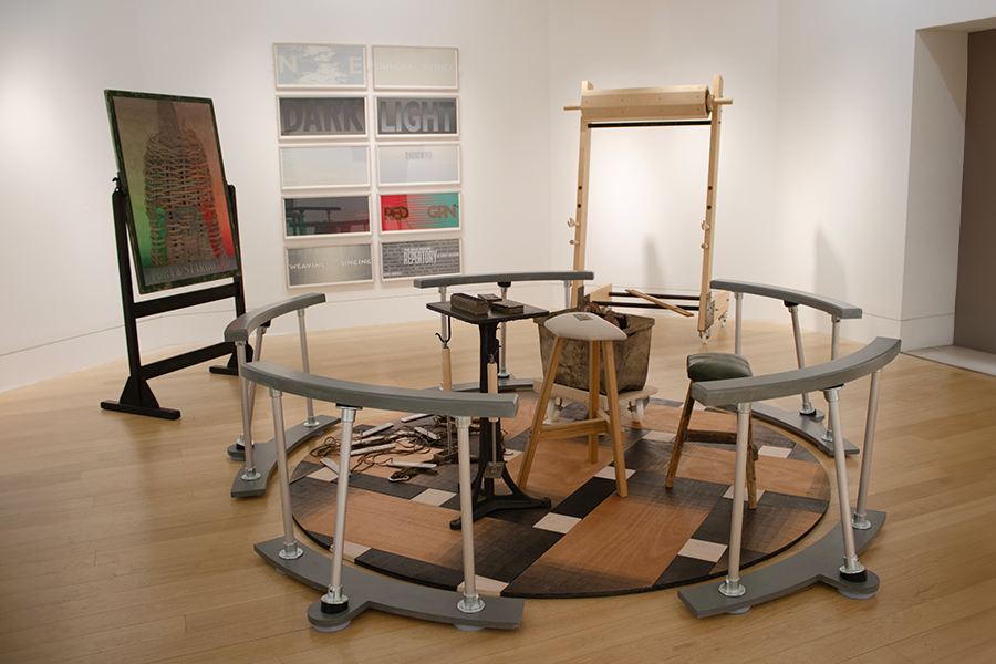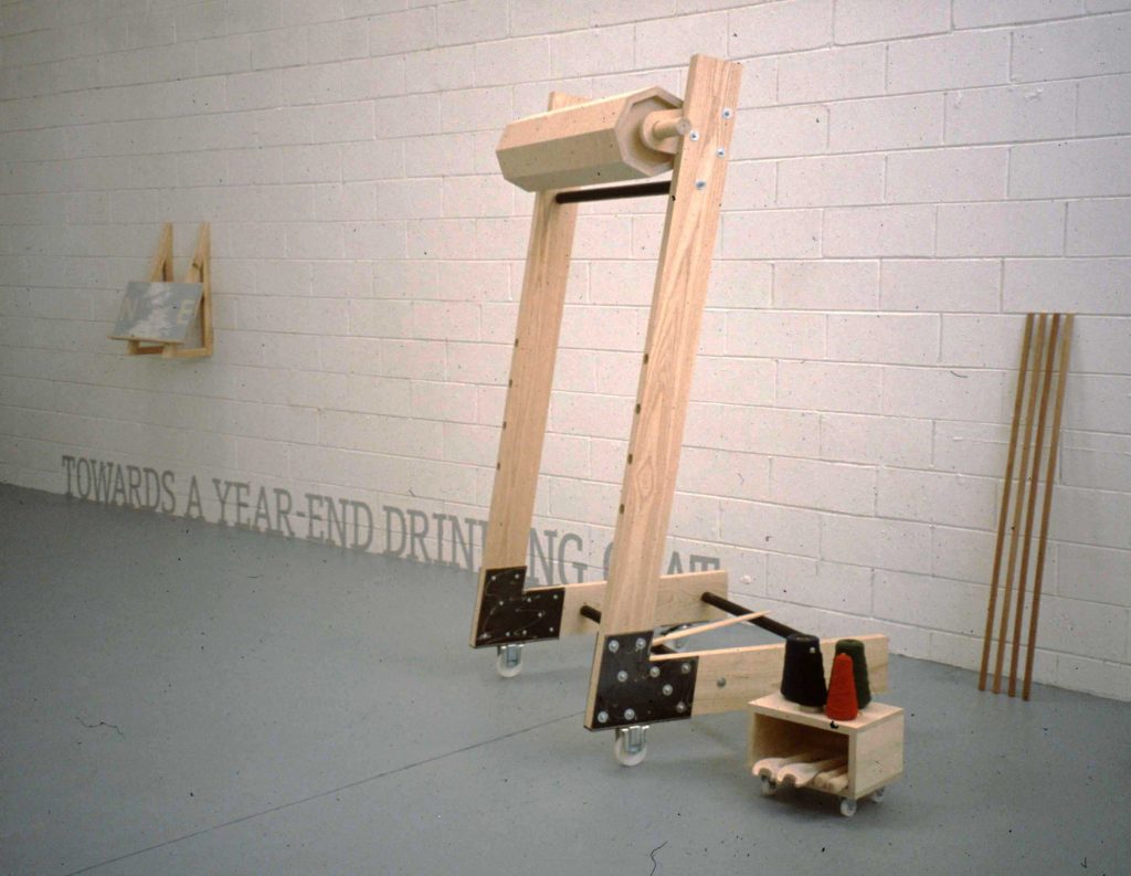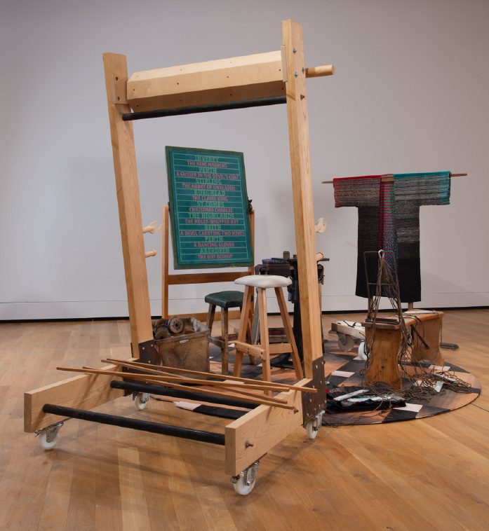 This installation is built round Towards a Year-End Drinking Coat shown in Venice in 2003. Here the coat for new year drinking has been made from yarn spun and fabric woven by Jimmy Hutchison and Erica Douglas. Its colours taken from Hogmanay night at the mouth of Aberdeen harbour. Loom weights are cast with the names of textile artists, yarns are wound onto vintage spindles, and a screenprinted jacket made in 1973 are displayed on a woven floor made from stained plywood.