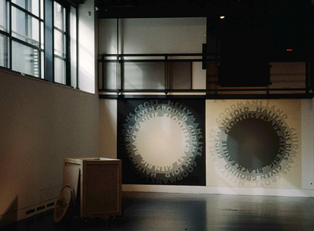 Bringing together some works from our exhibition Leaving Jericho at the John David Mooney Foundation, with new work in response to Richard Murphy’s double-height space in the DCA building. In Chicago a series of printed discs with images of goodman’s lands (ground left uncultivated for the devil): here dialect words for these lands are painted directly on the wall. As tonal opposites, one showed the light of Christianity emerging from pagan darkness, the other, the persistence of the old religion in the face of Protestant dogma.