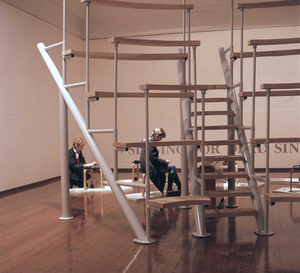 The structure, part anatomical lecture theatre, part auditorium, was rendered useless by removing the floor sections, these formalities having little meaning in the practice of the traditional singer. The essence of the work was 7 CD-Walkmans on constant play, each with a recording by a living singer of a song learned from one who had subsequently died.