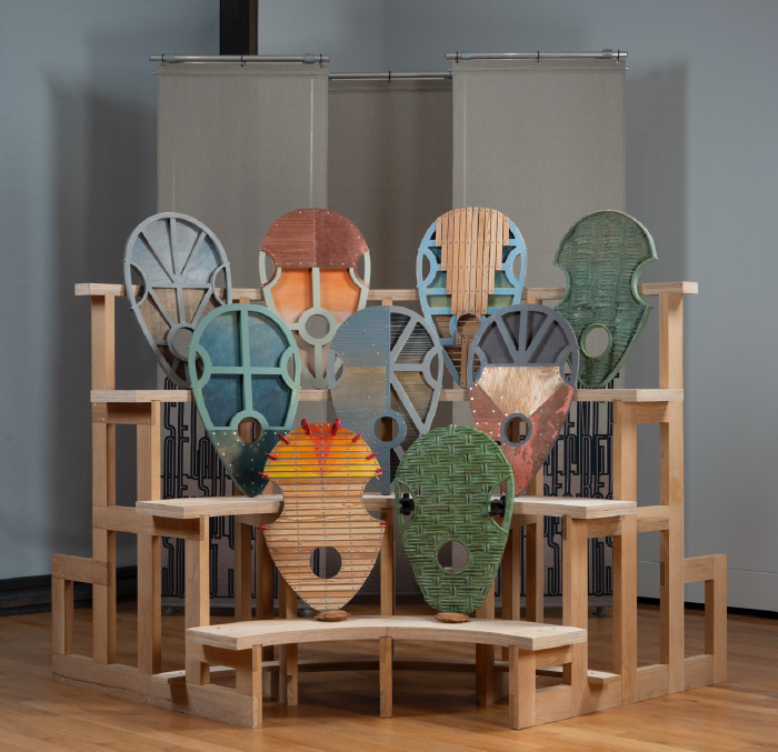 For the exhibition, Ages of Wonder, Scotland’s Art from 1540 to Now curated with Sandy Wood, I designed (and funded) a structure to display portrait busts from the collection of the Royal Scottish Academy. My idea was that at a later date I could make a series of small sculptures that could be shown on the structure. So in parallel with some of the prints also in Constructed Narratives, a series of masks began to coalesce. Rather than the great and good honoured by the academy  these would celebrate the anonymous makers of the songs and ballads that have since passed into oral tradition.