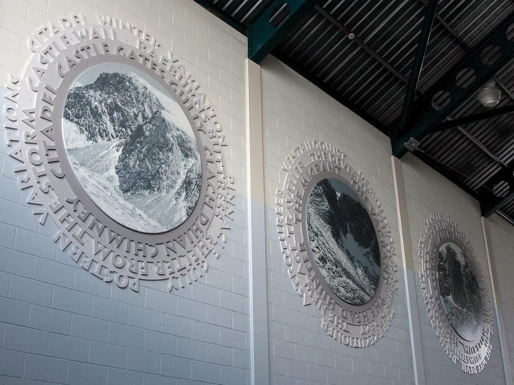 Snow Words: Hollow of the Snows is a tonal woodcut made in a temporary studio on the mountain. It is surrounded by rings of words for snow in scots, gaelic and travellers’ cant. Hidden Corries: Drawing Dangerously shows snowbound cliffs favoured by climbers, with concentric rings of text: a cumulative poetry of the ‘lines’ they have drawn on the mountain.
