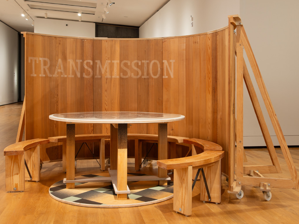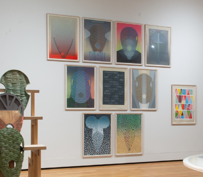 Using two octagonal galleries, one painted white the other dark grey, allowed a more dynamic install than the first iteration detailed below. Mentioning the Unmentionable and Transmission/Transmitters were not included, allowing A Year-end Drinking Coat on Woven Floor to expand into the white space. The central section is now enclosed by a series of curved balustrades whilst a new group of screenprints: Fists & Fankles, Thrums & Tangles around weaving and untangling are shown for the first time, along with two early prints of imagined woven structures.
