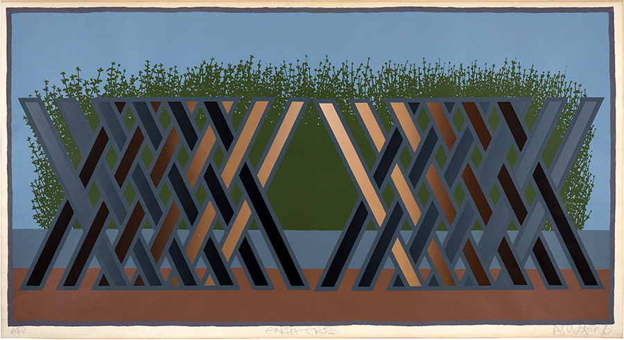 A sequence of prints based on a geometric arrangement of navigation signs,-lifebelts and fences at the edge of the sea at Fittie was cancelled to form a large tonal cross of Ben-day dot patterns. The printmakers’ device of scoring the plate to prevent further prints being produced is used here to conceptually refigure the work from its original form into an abstraction of the already abstracted image which is still present, but invisible under its veils of grey. The Fittie sequence was cancelled in four versions of the grey cross, each produced by a different series of overprints.