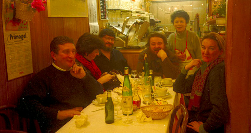 With Bruce Mclean, Clare Henry, David Harding, (restaurant owner) and Kate Whiteford on a preliminary visit to Venice to plan the exhibition, Three Scottish Sculptors, at the 44th Venice Biennale,1990.