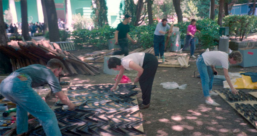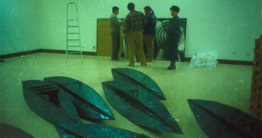 With Lorna Green (right) discussing the installation of Burning your Boats for Richard Demarco’s exhibition, New Tendencies in Scottish Art, at Collegium Artisticum, Sarajevo. Three woodcut prints along with nine plywood structures, made in the gallery, and tarred at a local building site.