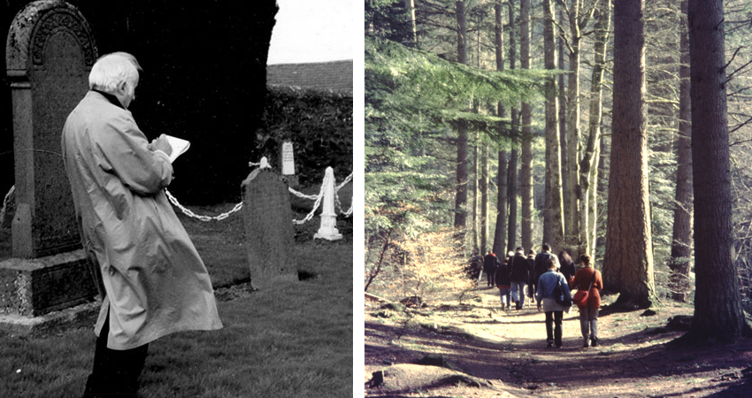Richard Demarco drawing in Eassie Churchyard, Angus during a field trip with Masters students. MFA students at Ossian’s Hall. (1996)