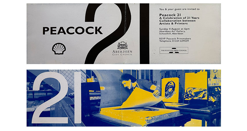 Private view card for Peacock 21: a Celebration of 21 Years of Collaboration between Artists & Printers. Stewart Cordiner printing The Whale by Jack Knox (proofs of The Lion by June Redfern pinned up) for the Scottish Bestiary, published by Paragon Press, London.