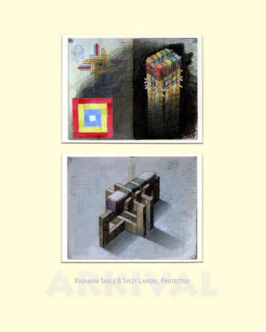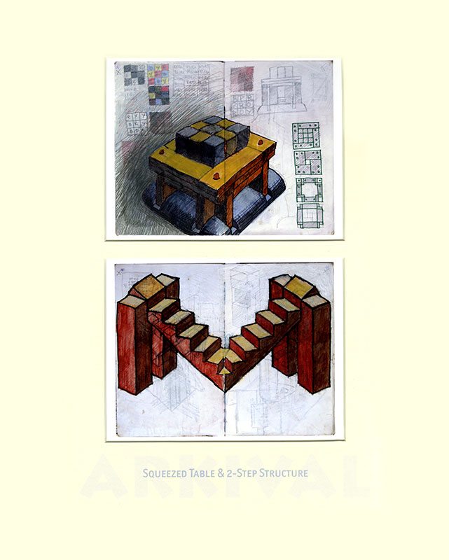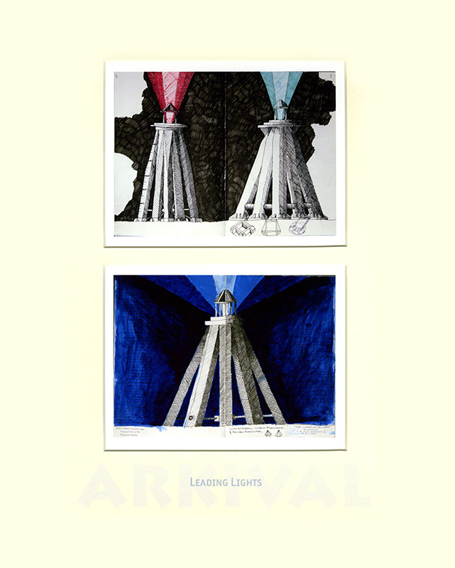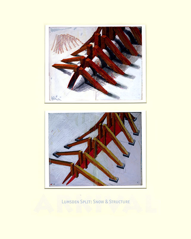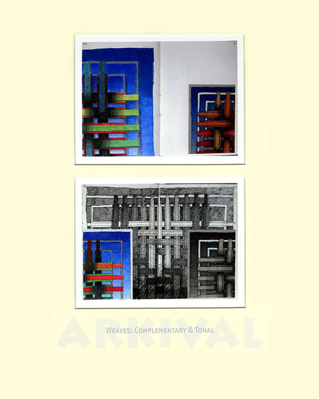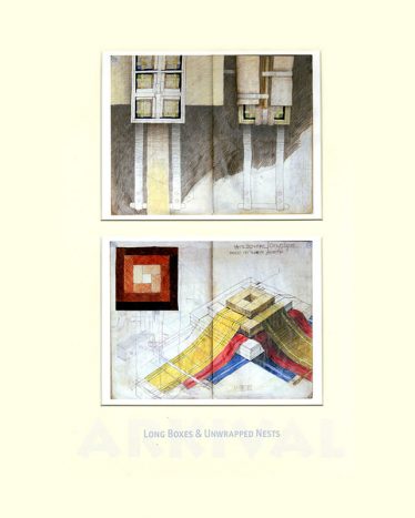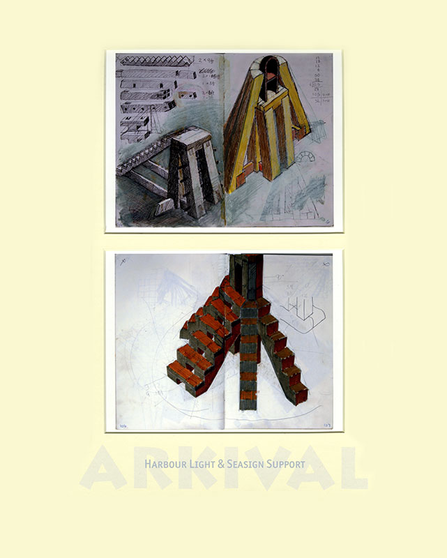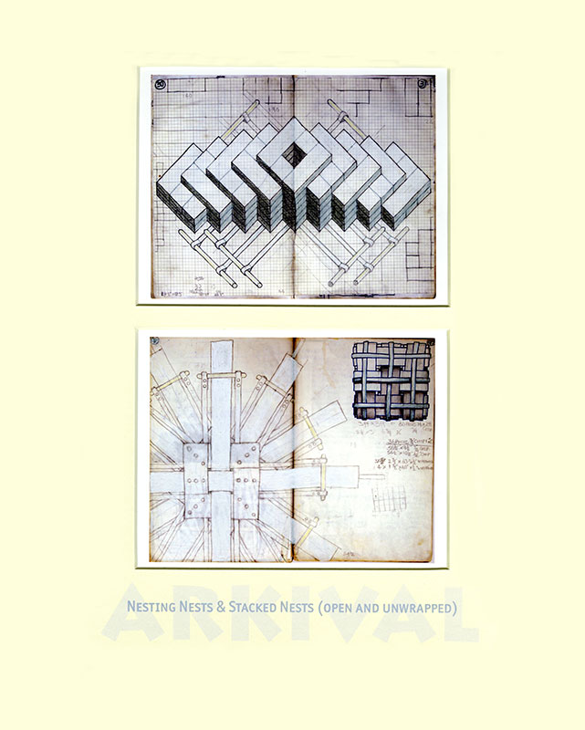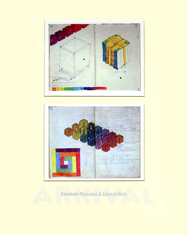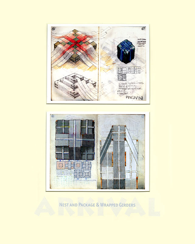From the mid 1970s when I left art school my visual development is charted in a series of hardback notebooks. For the project ARKIVAL a selection of double pages was made, digitised and printed at half-size. These were paired within 98 double mounts grouped into seven families, each in a solander box and all presented in a felt-lined shipping crate. In the books I retrospectively work over pages and many of these digital prints have also been enhanced by additional (or editional) drawing.