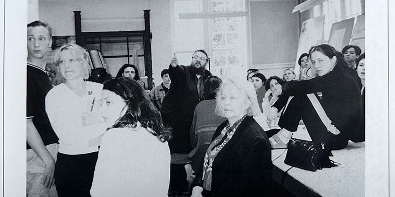 Masterclass in preparation for Richard Demarco’s staging of their opera ‘Euorpa’ for the Edinburgh Festival. AW standing centre, Sofia Kalinska (Tadeusz Kantor’s lead actress) front right. The team included Ariel Dorfmann (writing), Nigel Osbourn (music), Sofia Kalinska (drama), AW (props & costume)