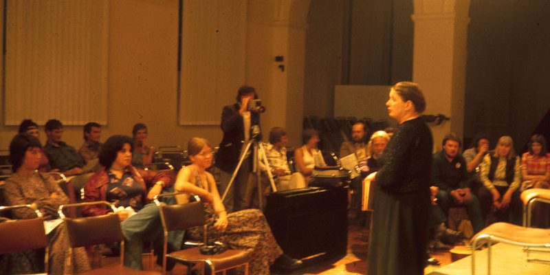 With traveller singer, from the right Lizzie Higgins with AW (left centre) at a recital of north east poetry and song organised by Annie Inglis, as part of Richard Demarco’s peripatetic summer school, Edinburgh Arts 75, at Aberdeen Art Gallery.